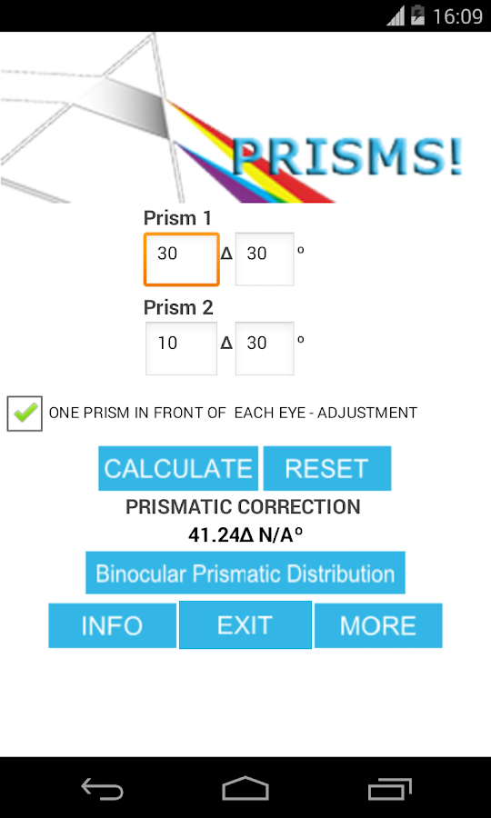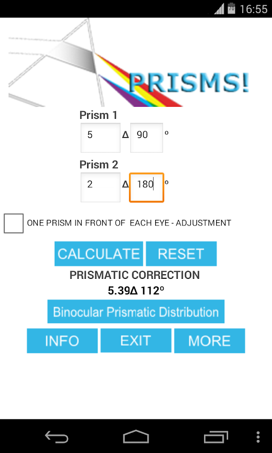 Necesitaríamos saber si los prismas son de vidrio o acrílicos, porque el índice de refracción no es el mismo y por tanto los ángulos varían. Llamemos Δ a la desviación total producirá y Φ al ángulo en el vértice de la suma de los 2 prismas. n2 sería el índice de refracción del material del prisma (vidrio 1.523, acrilico 1.49).Según coloquemos el primer prisma en cualquiera de las 3 posiciones, la potencia total se calcularía con las formulas: