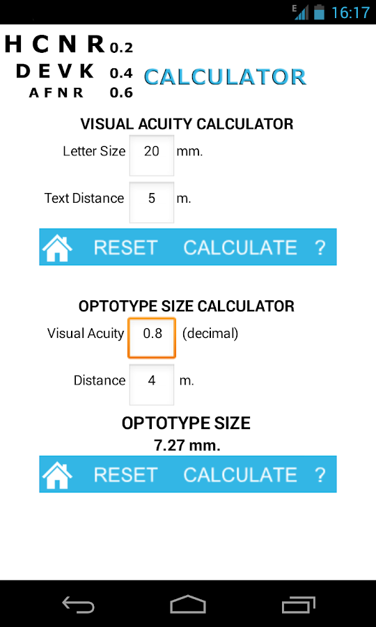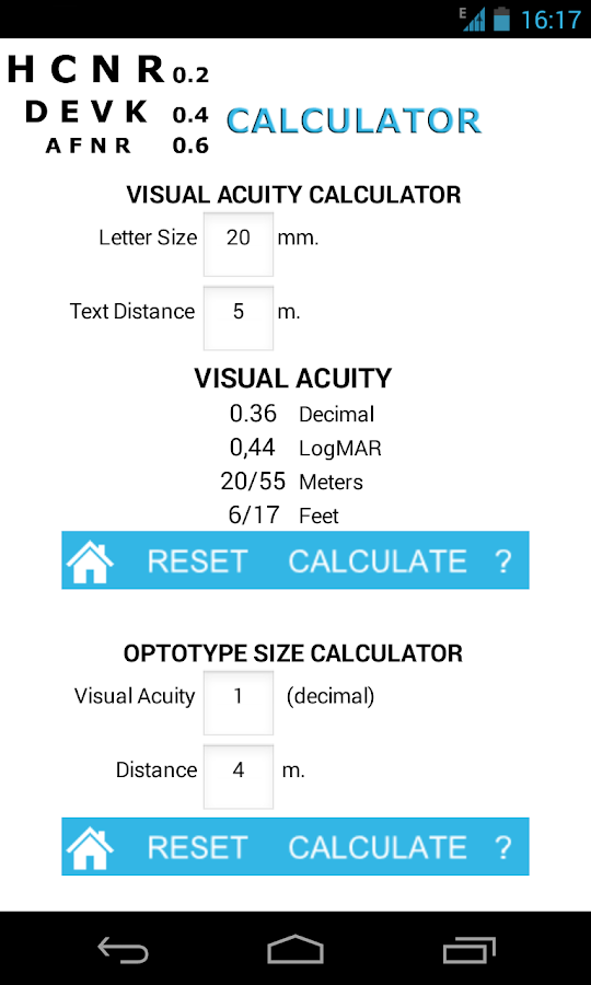 - Una calculadora de agudezas visuales y tamaños de letras para saber que agudeza visual tenemos si podemos leer un texto de un determinado tamaño a una determinada distancia, y cual es el tamaño que debe tener una letra para que al leerla a cierta distancia tengamos la agudeza visual que queramos.
