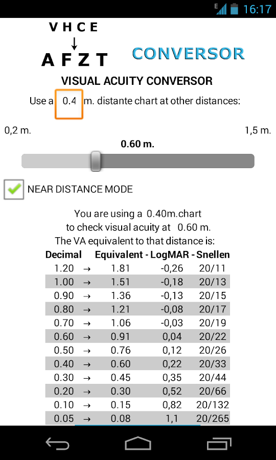 - Un conversor de optotipos para precisamente facilitarnos lo que decía arriba: usar un mismo optotipo para medir AVs a diferentes distancias de forma fiable y precisa.
