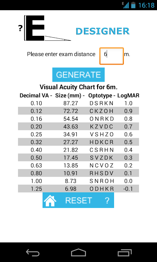 - Un diseñador de optotipos: porque ya que nos ponemos, podemos hacerlo todo del tirón, y diseñar nuestro propio optotipo, a la distancia que necesitemos, con los tamaños de los caracteres para todas las mediadas de agudeza visual.